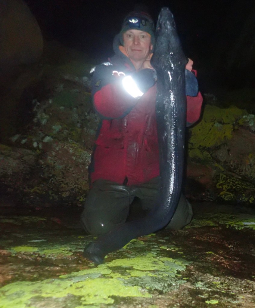 Then another slight lull in the weather so another North coast session on the eels. I arrived in daylight to try and catch some fresh bait managing a single Pouting on dusk before putting the Conger baits out. First up were small fish before a more positive bite that felt half decent when I lifted into it. Sod’s Law at the point it hit the surface a series of massive swells came through making it difficult to see the fish but it looked 20ish. I was just trying to wait for a gap in the swell to try and land it when a big wave washed it into the pool behind me making my job a lot easier. As it happens it wasn’t quite a 20 but at 19-3 not bad. I finished the session on 10 eels, quite a few over or around double figures with the next biggest 16-4, encouraging after so many poor years on the eels