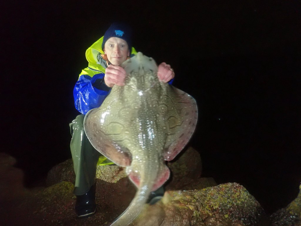Then it was a switch back to the big baits for the next session but I decided to hedge my bets a little and fish 1 rod for Conger, with my second rod scaled back a bit to target a Huss. The night started with a tiny dogfish followed by strap eels before a better bite and a nice slow pull down. When I wound into the fish I thought it was just a small eel at first but as it started coming it didn’t feel like an eel and I thought it would perhaps be a decent Huss. As it got closer in it got heavier and heavier which made sense when a nice Undulate Ray surfaced, not what I was expecting but certainly welcome. I managed to slide it up the rocks on a swell, and when I picked it up it felt quite decent. On the scales it went 14-5, my first Undulate in 3 years certainly put a smile on my face.