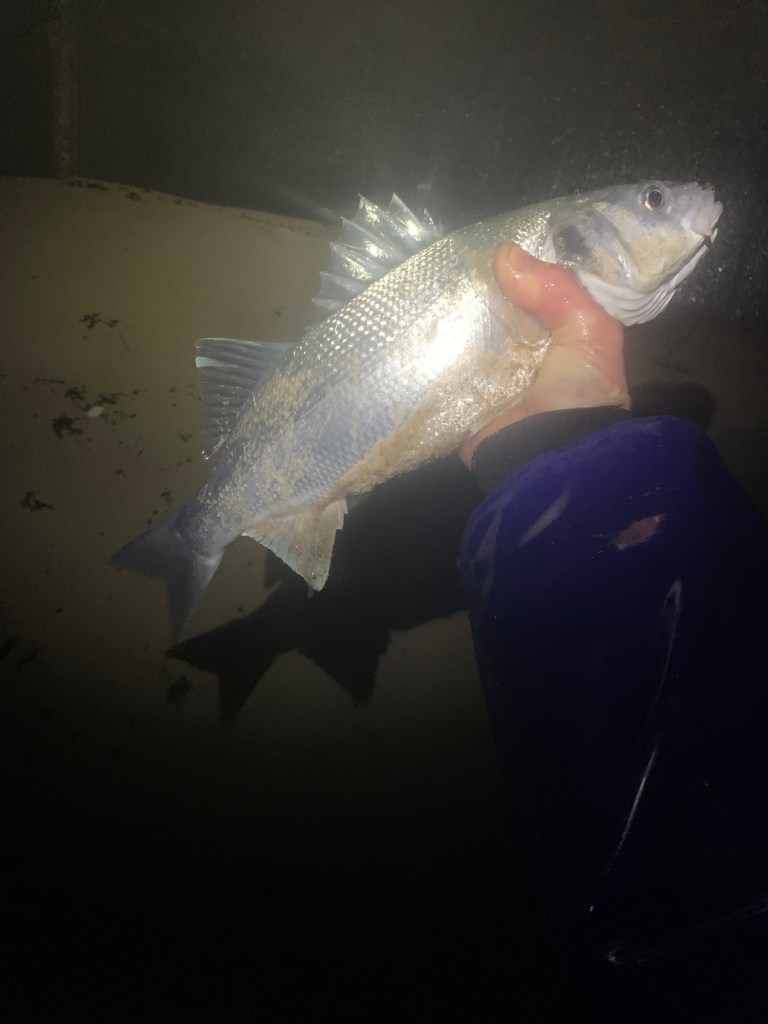 It then went quiet so I moved along to the next point and 2nd cast again I got hit by what felt like a much better fish. It made a couple of really strong runs before it was close enough to see, I turned on my headlamp and was a little surprised it wasn’t a big bigger. I managed to slip it in the next In between the swells, a slight improver of 53cm.