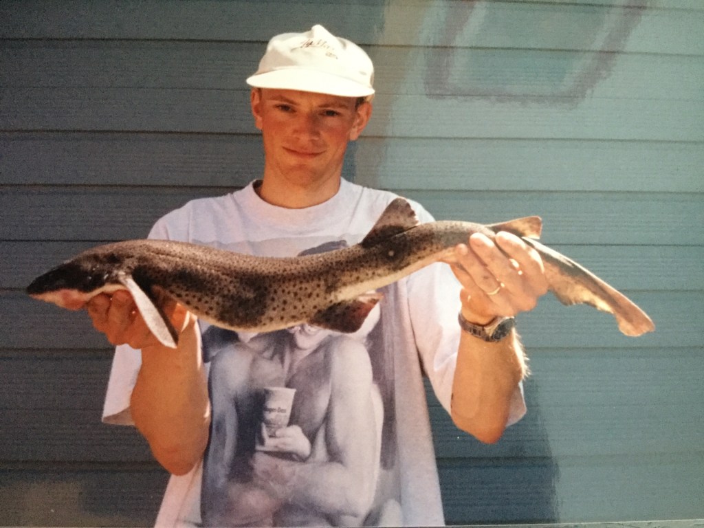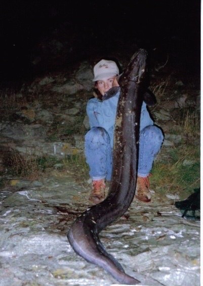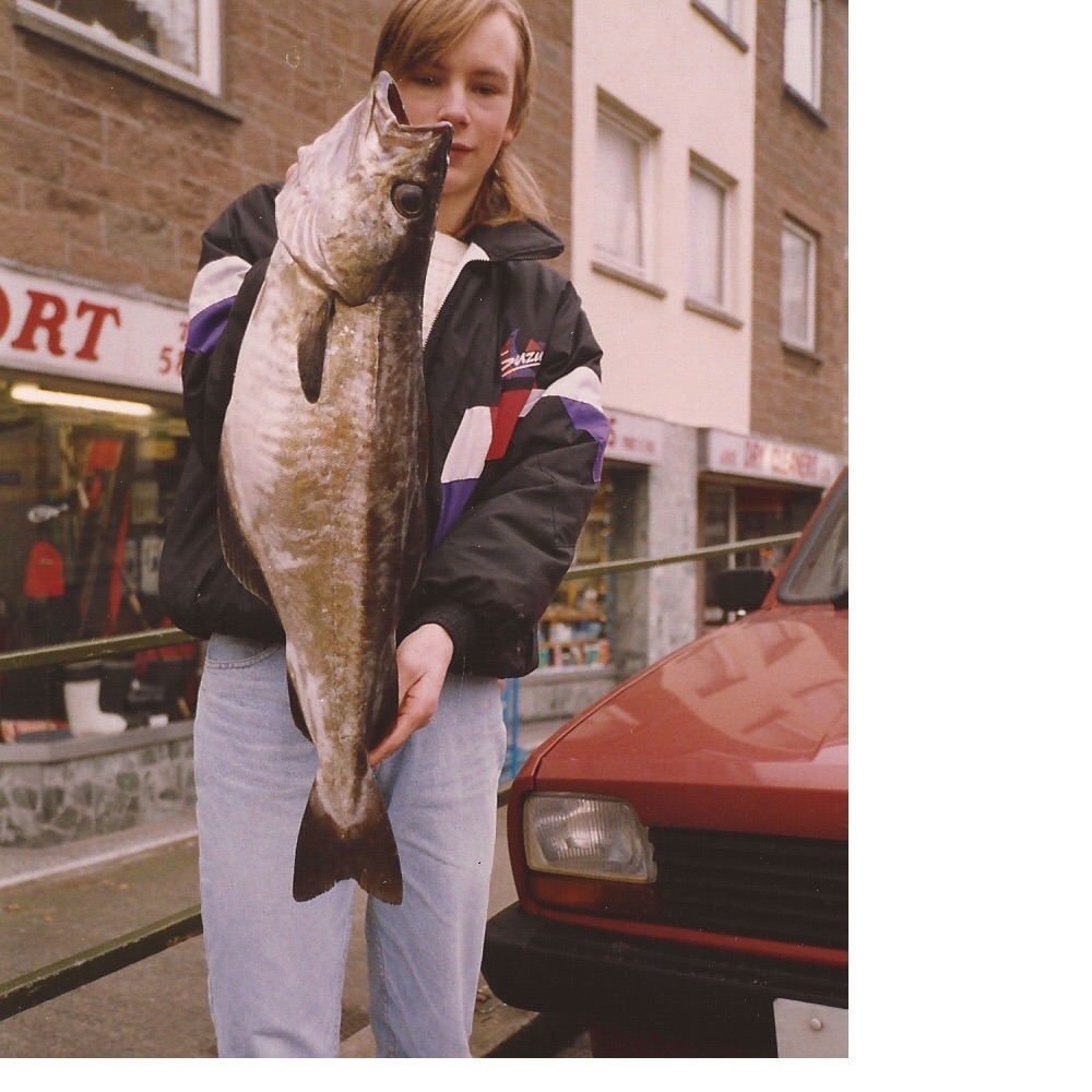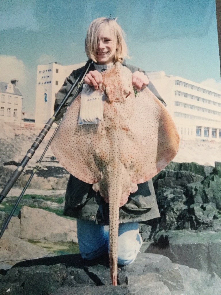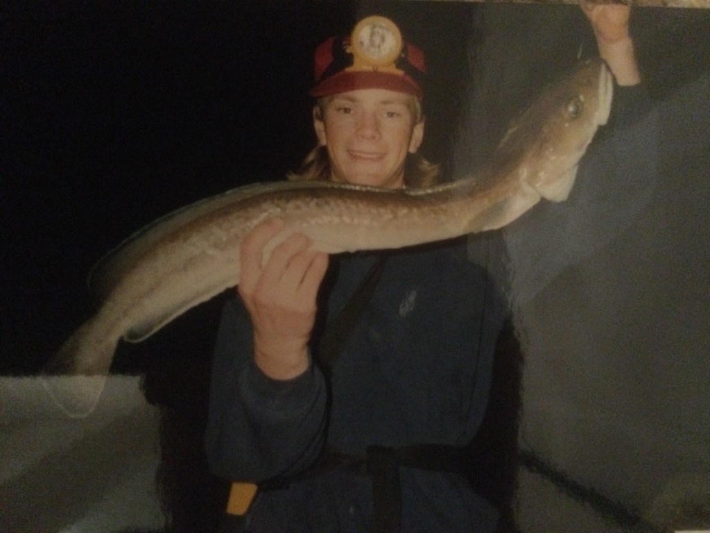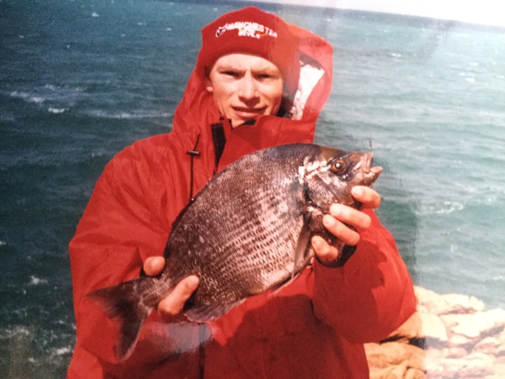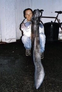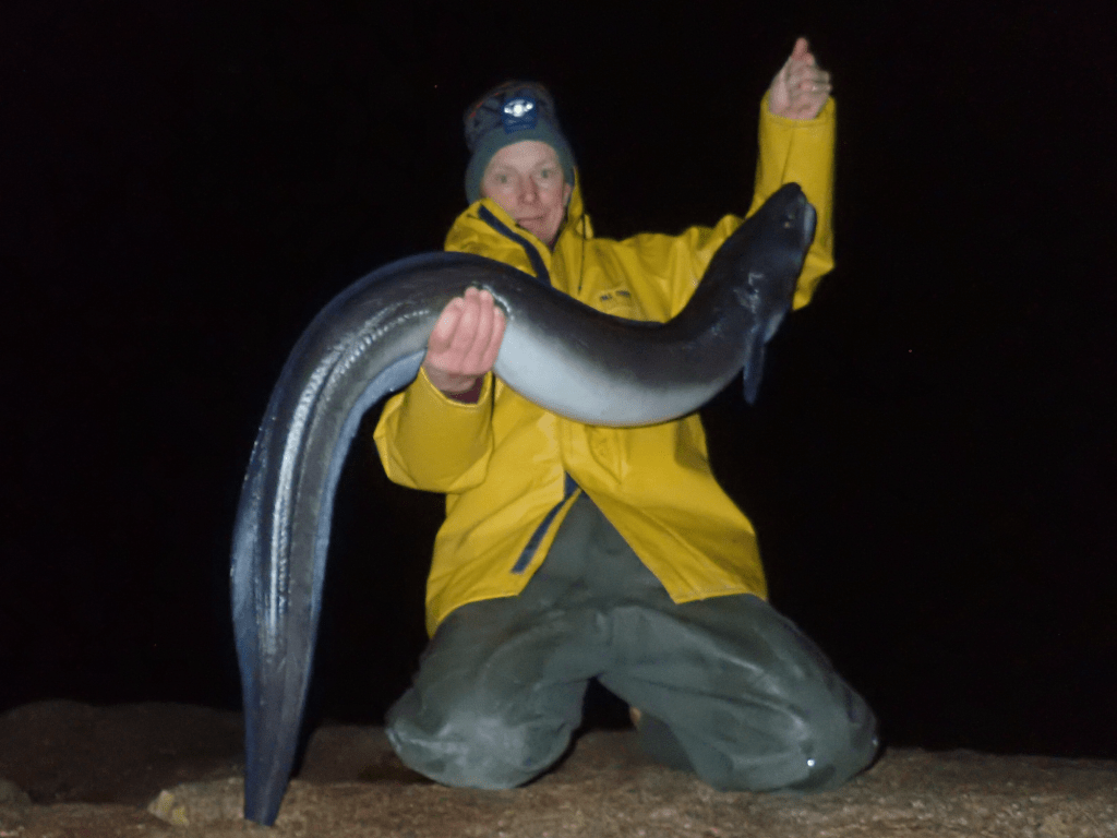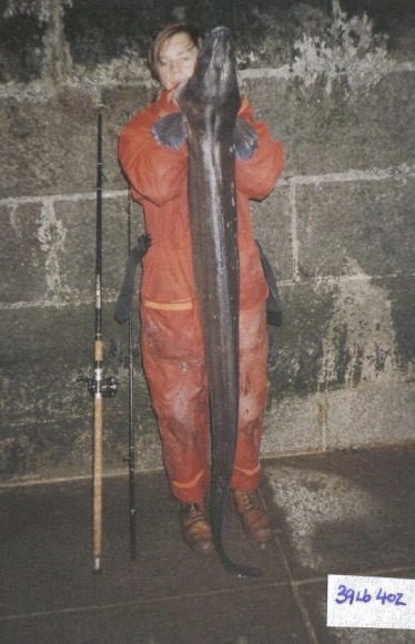 Eventually I got fed up with the endless Pout so decided to leave a small one on and lob it back out as a live bait. I can’t of been much more than 15 yards out in a few feet of water. It wasn’t long before I could feel the Pouting going mad and I said to Dad, this is gonna go soon. Sure enough a nice slow pull and I stuck expecting to hook into a nice Bass. What I actually got was snagged which I couldn’t understand as we had not long been standing where my bait was and it’s just sand. I tried giving it some slack but nothing happened. Eventually I though I would have to pull for a break so wound down tight, pointing the rod at the water and started walking backwards. That’s when the snag started moving at pace in the opposite direction. Oddly the first run was quite short before I managed to make some line and started pumping something really heavy back towards me. It was so heavy I could barely move it with the little spinning rod. We were speculating what it could be, big Ray, maybe a big Cod as a few had been caught on the breakwater. We didn’t have to wait long to find out as it finally realised it was hooked and the tail of a really big eel came out of the water as it turned and started powering out to sea. At this point with a 12lb hooklink I’m thinking this won’t last long. Over the next 15 minutes we had a too and fro, the fish would take a load of line and then I would gradually get it back to within about 20 yards of the beach but with no Gaff or net it was going to be difficult getting it in. It then went on a mad run along the beach hugging the back of the rocks and with such a short rod I had no control and could only hang on and hope for the best. Eventually I got it back in front of us and clearly it was tiring. Dad waded out into the surf to try and grab it but getting hold of an eel in the water is just about impossible. To make matters worse he had a floatation suit on and the waves were lifting him off the bottom. The eel then swam straight between his legs and the line got caught around his legs. Luckily by this point the eel was exhausted and didn’t make any runs which surely would of been fatal. Dad managed to untangle himself and then the amazing happened, the eel obviously disoriented swam straight onto the beach and dried itself. I ran over and grabbed the trace and the 12lb line parted in my hand with the 3/0 Viking firmly in its top lip stopping the eel biting through the trace. I couldn’t believe we had landed it, the amount of luck involved was ridiculous. As we all used to do in those days we took it to get weighed, it didn’t quite make 40 but I wasn’t complaining at 39lb 4ozs.