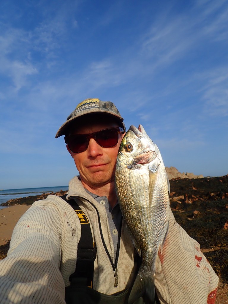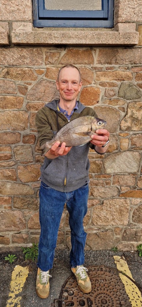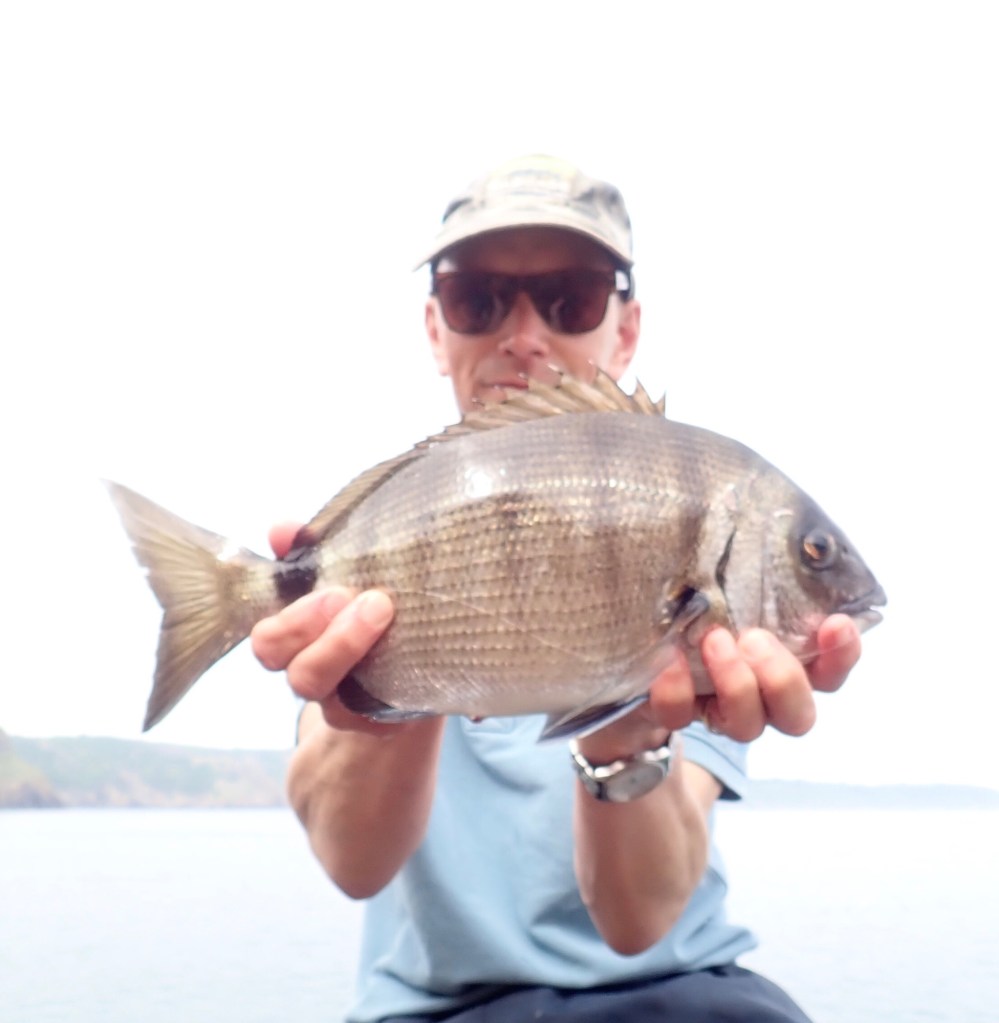 Day 2 started with an unsuccessful bash for a mackerel before going back on the Black Bream. I was catching loads of small bream, as well as a Thicklipped Mullet just under 3lb and a scad before I hooked what felt like a much better bream. A few hairy moments trying to net it in a big swell and I knew it would be over the 1-8 minimum size. Back on the mackerel for an hour with no joy before going down to the weigh in with my bream going a decent 1-13-4