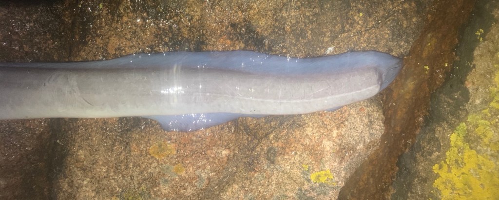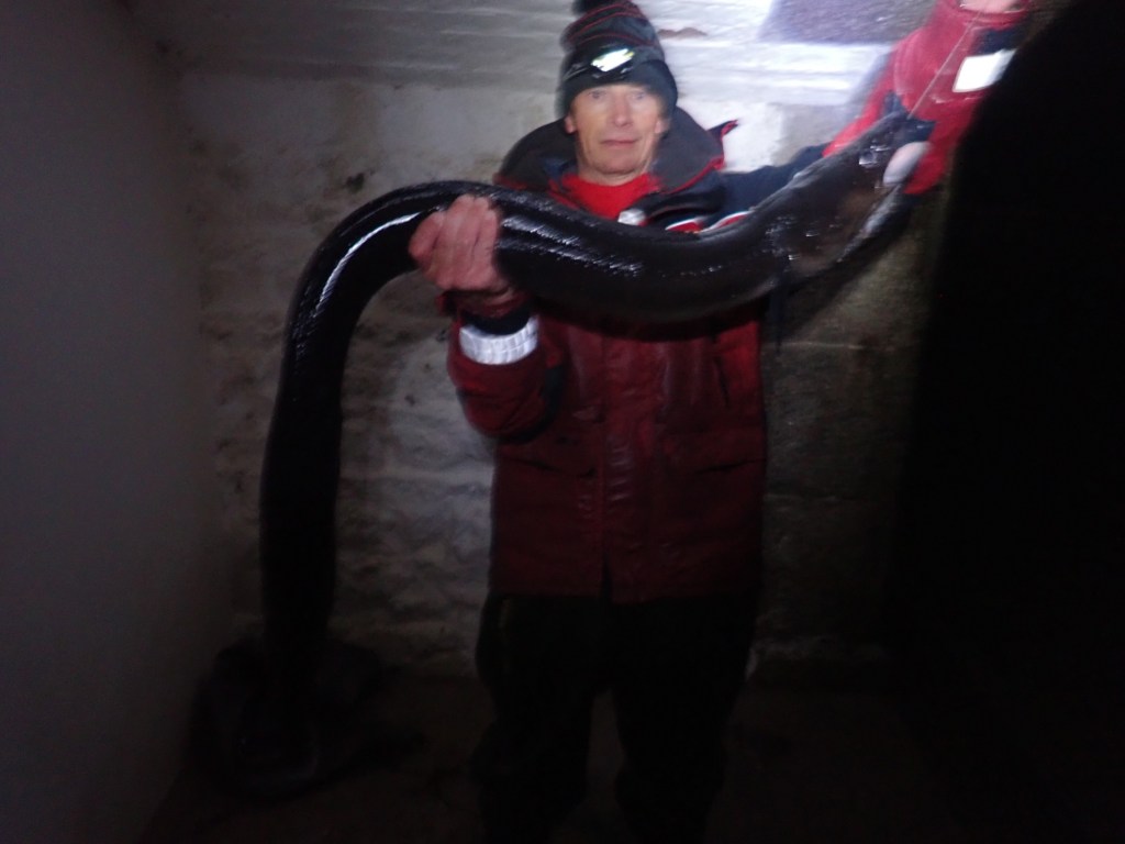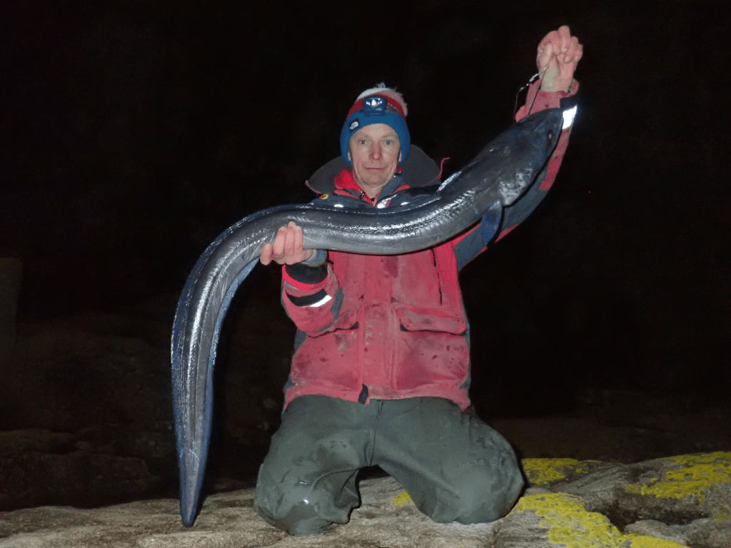 Next up was a night session with big baits hoping for a Conger or Huss. As is typical these days with the amount of small eels around I had bites from the start. Second cast I had a more positive bite which felt like a slightly better fish when I wound into it. Once on the surface it looked ok so I climbed down and traced it out. A reasonable eel of 14-4.
